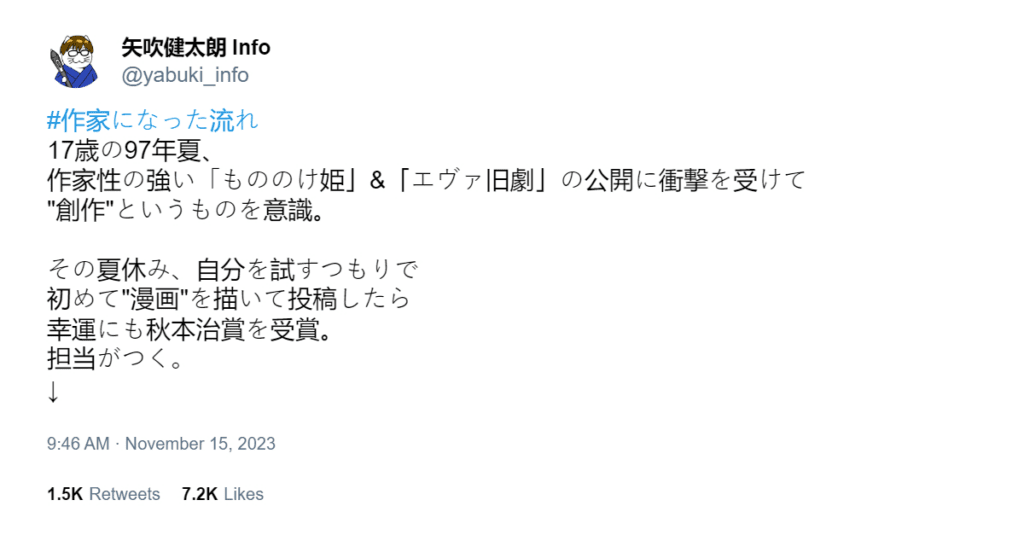 reflects on his beginnings in the manga industry. Yabuki remembers the