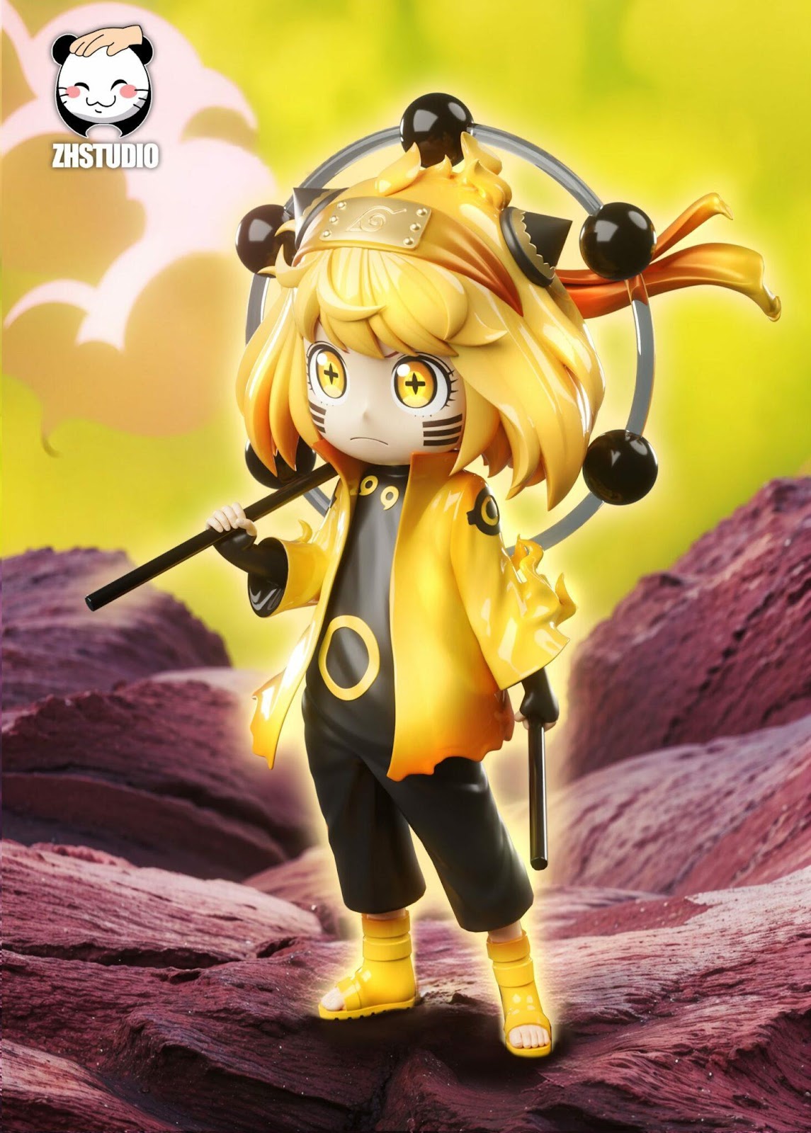 figure is decorated with a design reminiscent of the nine-tailed fox's chakra